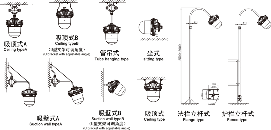安裝方式:A:吸頂式 b:管吊式 c:吸壁式 d:法欄立桿式 e:護欄立桿式