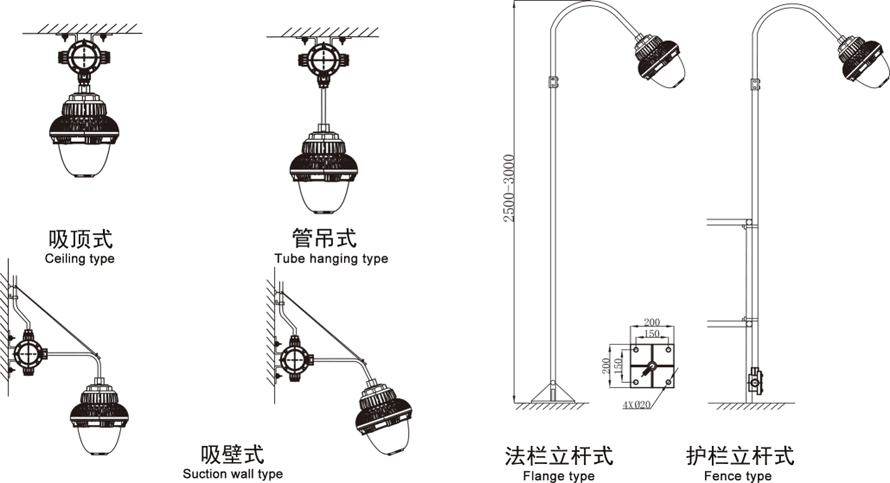 安裝方式:A:吸頂式 b:管吊式 c:吸壁式 d:法欄立桿式 e:護(hù)欄立桿式