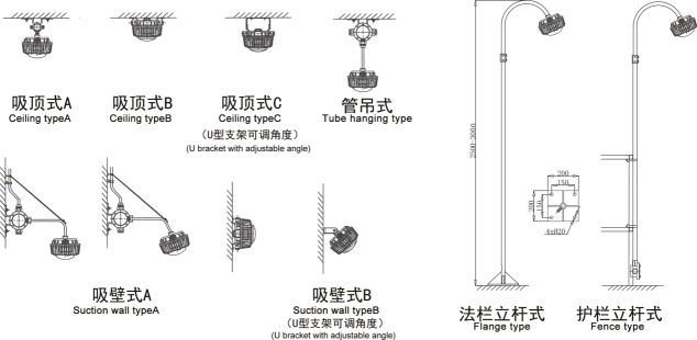 安裝方式:A:吸頂式 b:管吊式 c:吸壁式 d:法欄立桿式 e:護(hù)欄立桿式