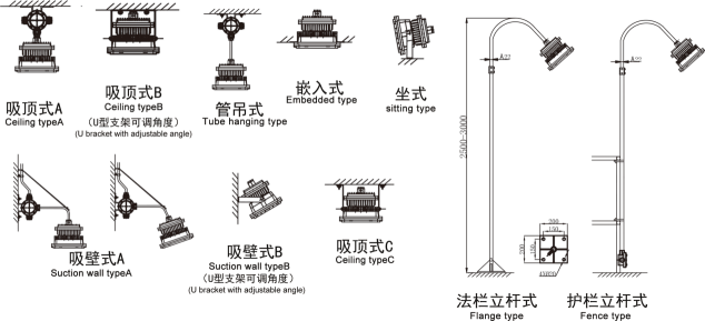 安裝方式:A:吸頂式 b:管吊式 c:吸壁式 d:法欄立桿式 e:護(hù)欄立桿式